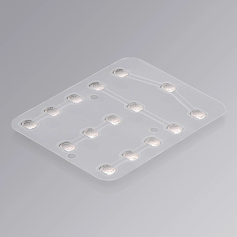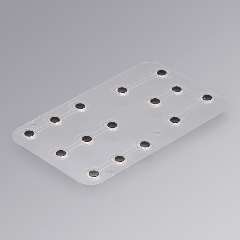 Our product is a metal dome switch array consisting of white transparent PET dome carriers backed with pressure-sensitive adhesive, enhanced with black PET domes and featuring a double-layer structure air channel venting layer.We customize dome arrays according to your preferences, including the style and quantity of domes you prefer, cut to your specific size and shape requirements. Additionally, we offer the flexibility to incorporate different sizes, shapes, and forces of metal domes within the same array.