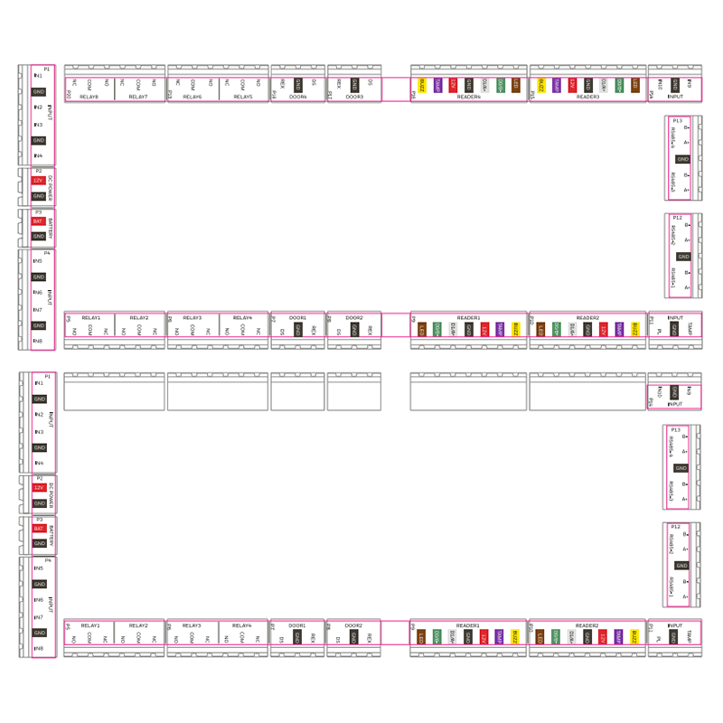The pink lines (cutting lines) on the drawing indicate pre-cut sections for terminal mounting.