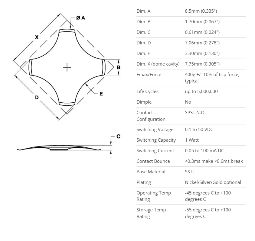 Cross-shaped Metal Dome, 8.5mm, 400gf - High-Quality Metal Snap Dome for Precision Applications